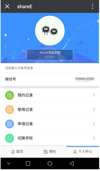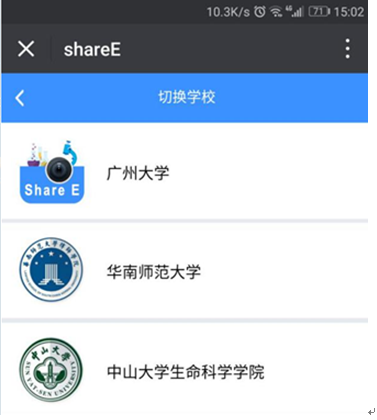 2、进入shareE预约助手公众号,在我的个人信息“切换学校”列表页面选择自己学校