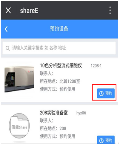 4、设备预约:点击页面下方的【预约】导航,进入“预约设备”列表,搜索到自己想要预约设备然后点【预约】或者【送样】,然后按提示完成机时预约或者送样预约。